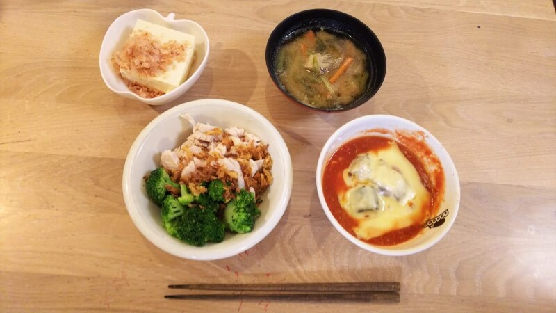 作り置きの鶏ハムとブロッコリーのサラダ、木綿豆腐の冷奴、前日夜の具沢山の味噌汁。